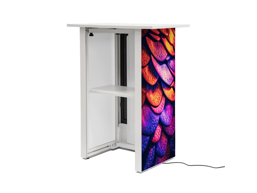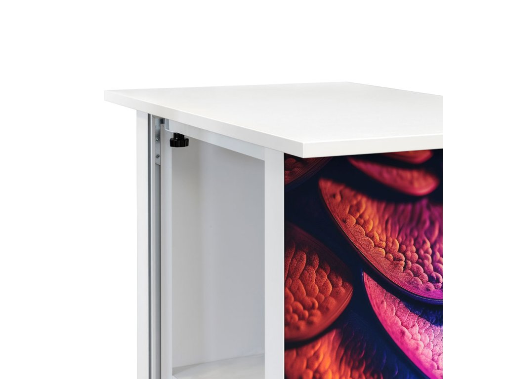 Digitální promostolek Futuro má boční látkové stěny standardně s černým potiskem (látka se silikonovými okraji). Svůj promostolek si ale můžete podle libosti vyladit vlastním designem na bocích! Potřebujete další design? Jen vyměňte látku a můžete začít!