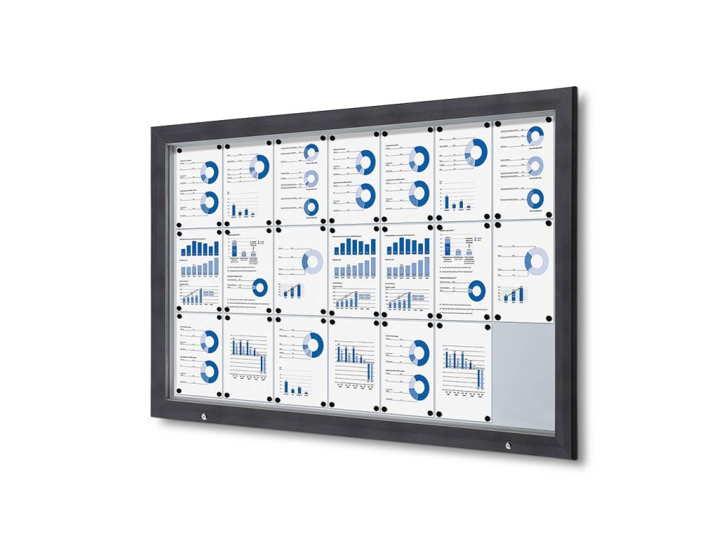 Zabezpečená venkovní vitrína přináší čelní dveře s bezpečnostním sklem (4mm) a možnost uzamčení. Plechová verze s popisovatelnými zády má navíc protipožární certifikaci B1. Odolnost vůči nepřízni počasí je zajištěna silikonovým těsněním s certifikací IP56, přičemž vitrína disponuje robustními hliníkovými profily a odolnou zadní stěnou. Pohodlnou manipulaci zajistí horní panty dveří vybavené plynovými otvíracími písty.