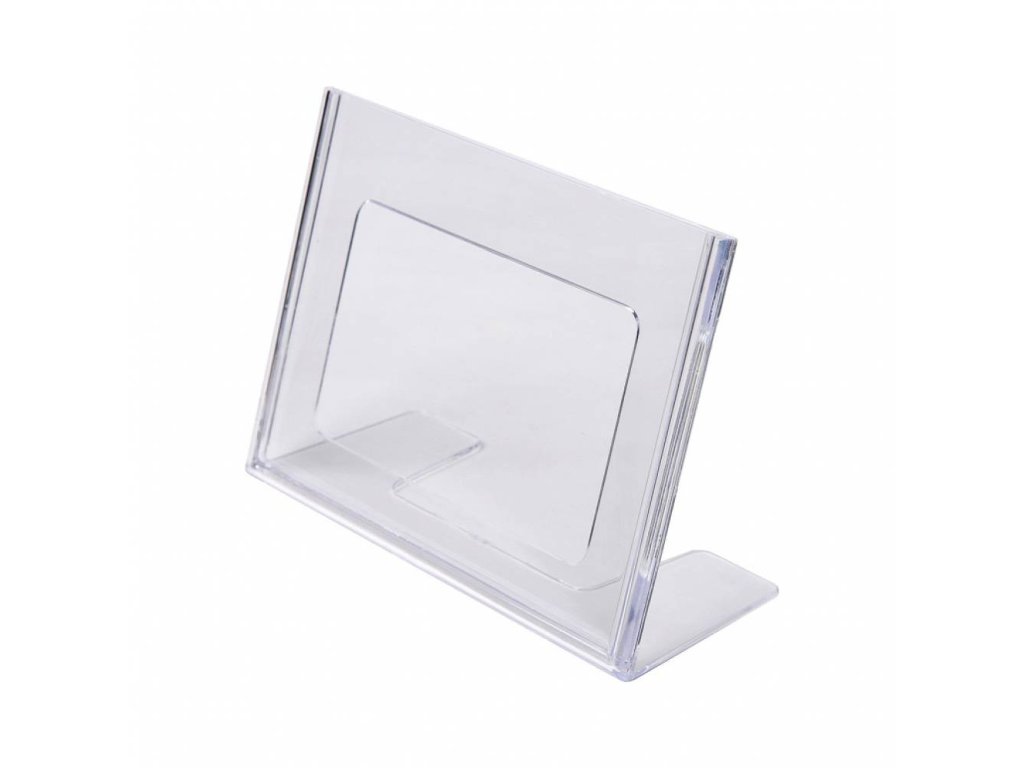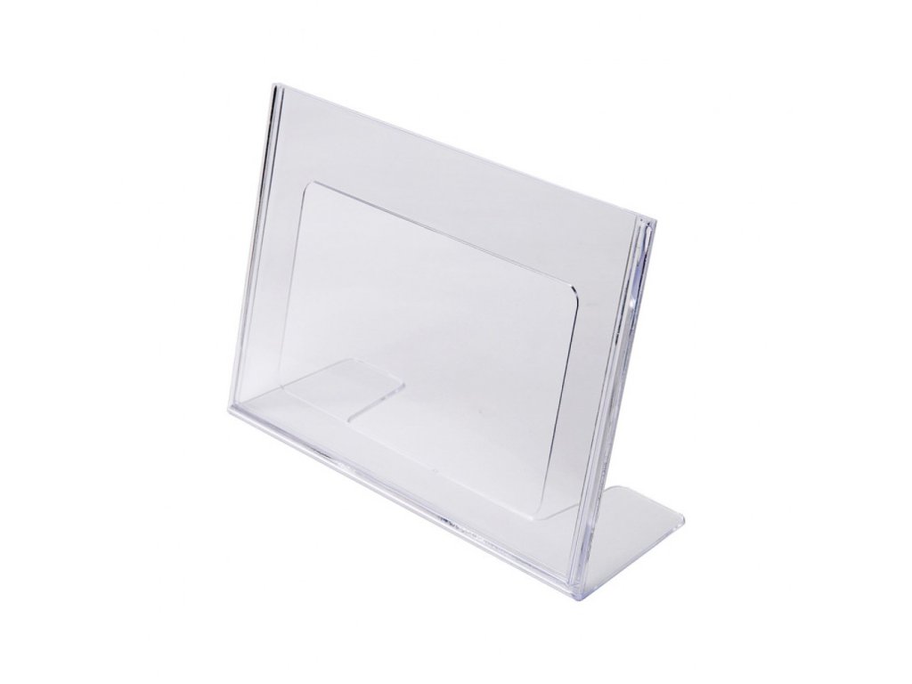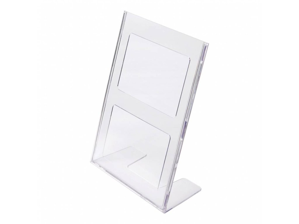 Praktický stolní stojánek na letáky SCRITTO® ve tvaru L, ideální pro prezentaci letáků, jídelních lístků či informací na pultu nebo stole. Vyroben z kvalitního čirého plastu, dostupný ve formátu A4, A5 nebo A6, a to na výšku i na šířku. Skvělá volba pro hotely, restaurace i kanceláře.