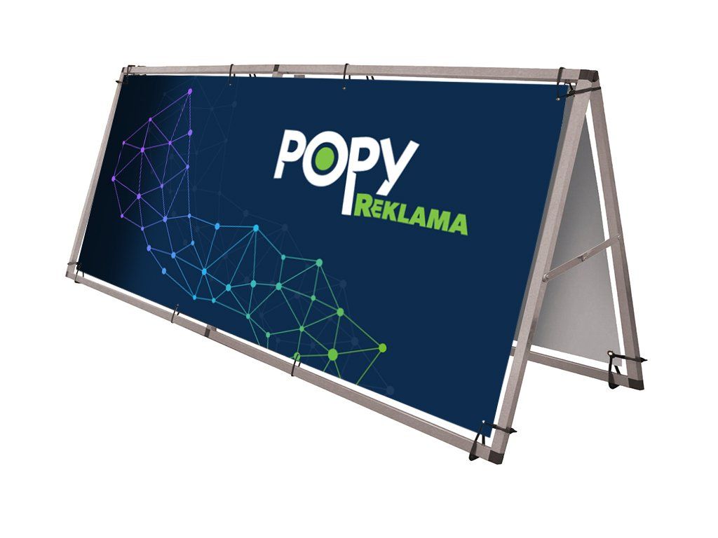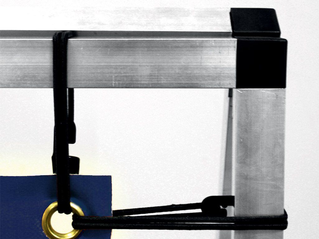 Konstrukce je vyrobena z lehkých, ale odolných hliníkových trubek, které zajišťují stabilitu i při nepříznivých podmínkách. Systém je navržen jako A-frame (áčko), což zaručuje vysokou pevnost a zároveň jednoduché použití. Díky pružnému uchycení grafiky pomocí elastických lanek (bungee) je banner vždy perfektně napnutý a dobře čitelný.