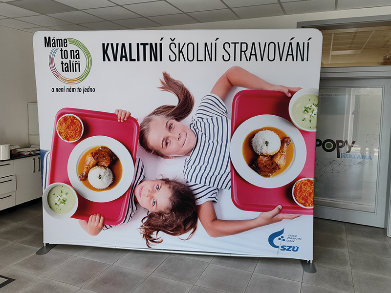Textilní potah je po nasazení napnutý a hladký, takže grafika působí čistě a reprezentativně. Vhodné jako pozadí stánku, brandingová stěna nebo foto stěna.