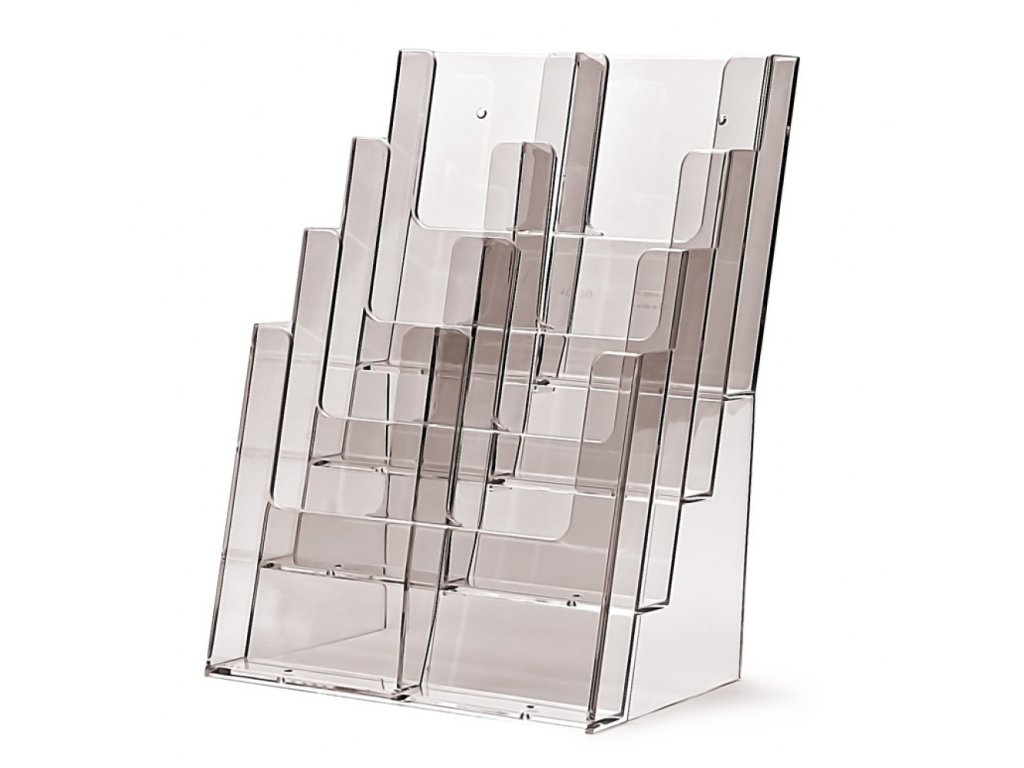 Stojánek na letáky s oddělovačem a čtyřmi kapsami za sebou je skvělým pomocníkem pro organizované vystavení vašich materiálů. Je vyroben z čirého plastu, který zajišťuje perfektní viditelnost obsahu a profesionální vzhled. Díky praktickému rozdělovači lze kapsy upravit pro formát A4 nebo 1/3 A4 (DL), což z něj činí univerzální řešení pro letáky, brožury či prospekty. Vhodný pro použití na recepcích, pultech, výstavách nebo v kancelářích.